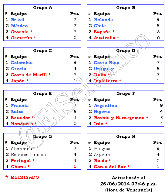 Fase de grupos mundial 2014 resultados. En esta sección también puedes encontrar clasificación calendario fixtures goleadores amonestaciones y estadísticas de esta competición. Los partidos y tabla de posiciones de copa mundial se actualizan en tiempo real. Aquí puedes encontrar todos los resultados copa mundial brasil 2014 en vivo y en directo.